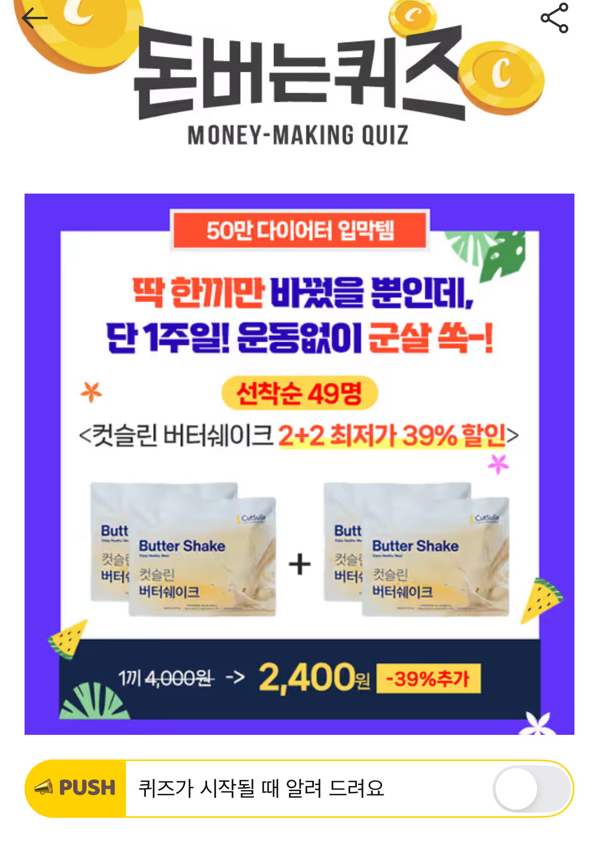 캐시워크 돈버는퀴즈 정답 컷슬린 버터쉐이크
