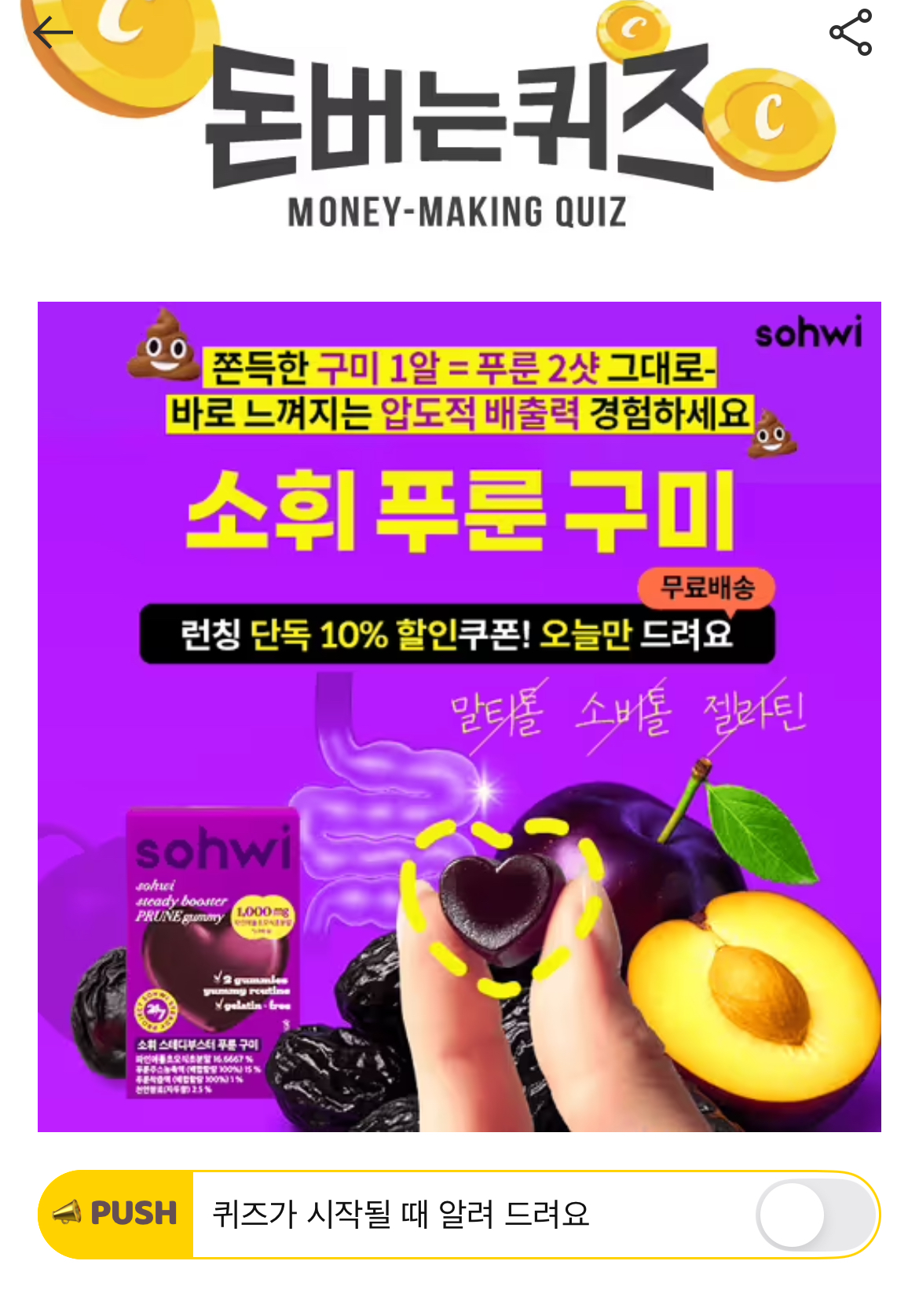 안찌는 체질의 핵심! 역대급 신상 <소휘 푸룬 구미> 압도적 배출력으로 뭘 먹어도 싹 밀어내는 체질 만들어 드릴게요. 단7일! 런칭 10% 특가 소진시 조기종료 [1.6억+ 전량완판] 쫀득한 구미 1알에 푸룬 2샷 그대로 채워 푸룬 1알의 OOOO는 그대로! 당류, 칼로리는 50% 이상 다운 시켜 맛있고 건강하게 즐길 수 있어요. 여기서 OOOO는?