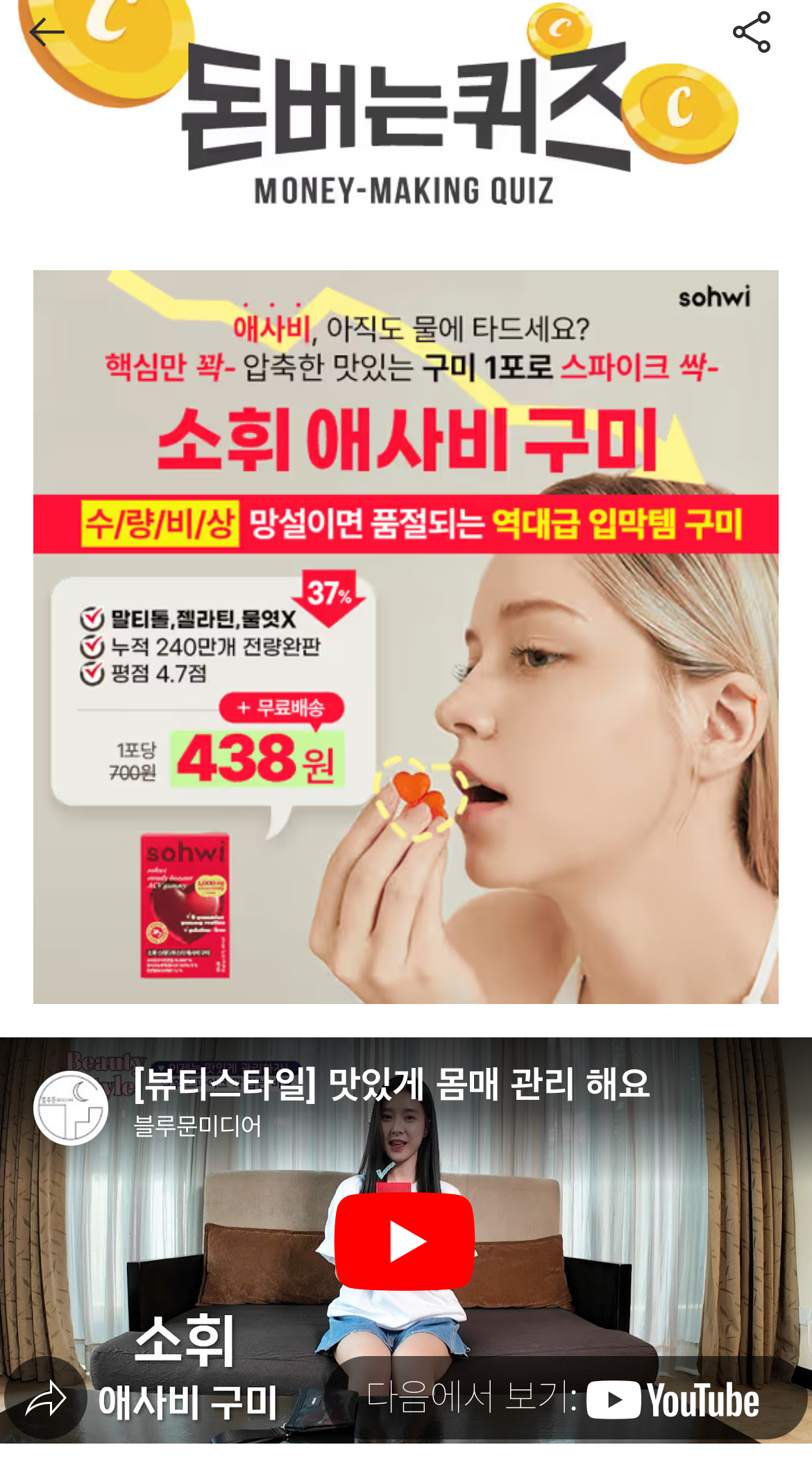 입이 자꾸 심심한건 '스파이크' 때문! 설탕가득 군것질 대신 <소휘 애사비 구미>로 입터짐 딱! 막아드려요 망설이면 품절돼요 "밥 먹고 입터질거 같을때 구미 딱2알이면 다른거 먹을 생각 안나요! 성분도 좋아서 OOO 대용으로 딱! 개별 포장이라 가지고 다니기도 편해요!" 여배우의 찐후기 입니다! 단 1포로 스파이크 컨트롤! 여기서 OOO은?