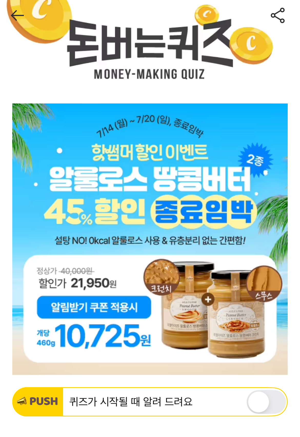 캐시워크 돈버는퀴즈 정답 리얼마이즈 알룰로스 땅콩버터 크런치 스무스