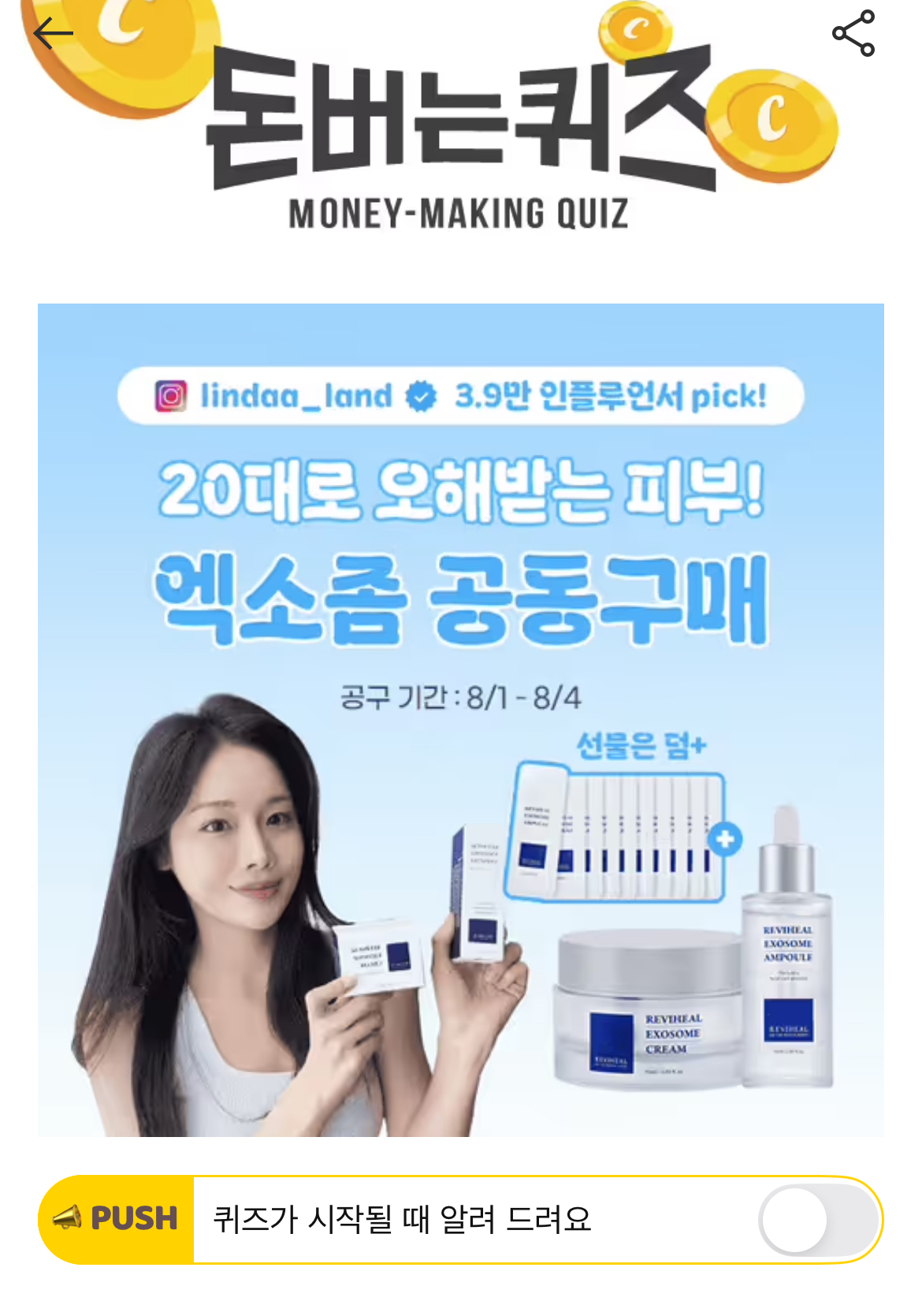 8/1~8/4 단 4일간 인플루언서 린다와 리비힐이 만나 공동구매를 진행합니다. 역대급 할인에 무배와 선물은 덤+ 구매만 해도 100% 증정 받을 수 있는 선물은 OOOO원 상당의 앰플샘플 10개입니다.