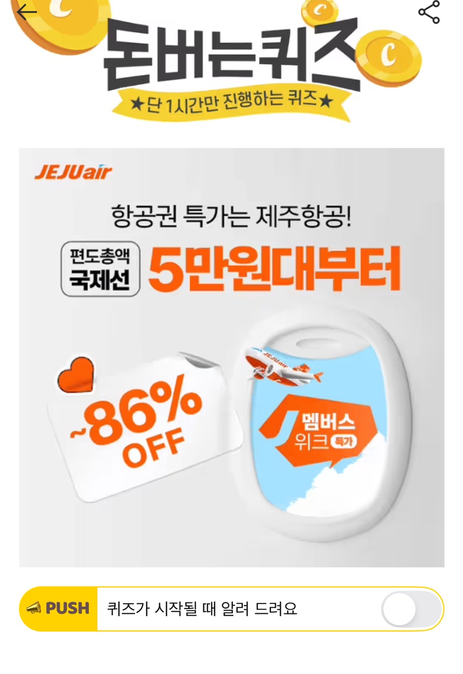 캐시워크 돈버는퀴즈 정답 제주항공 국내선 최대 OO%