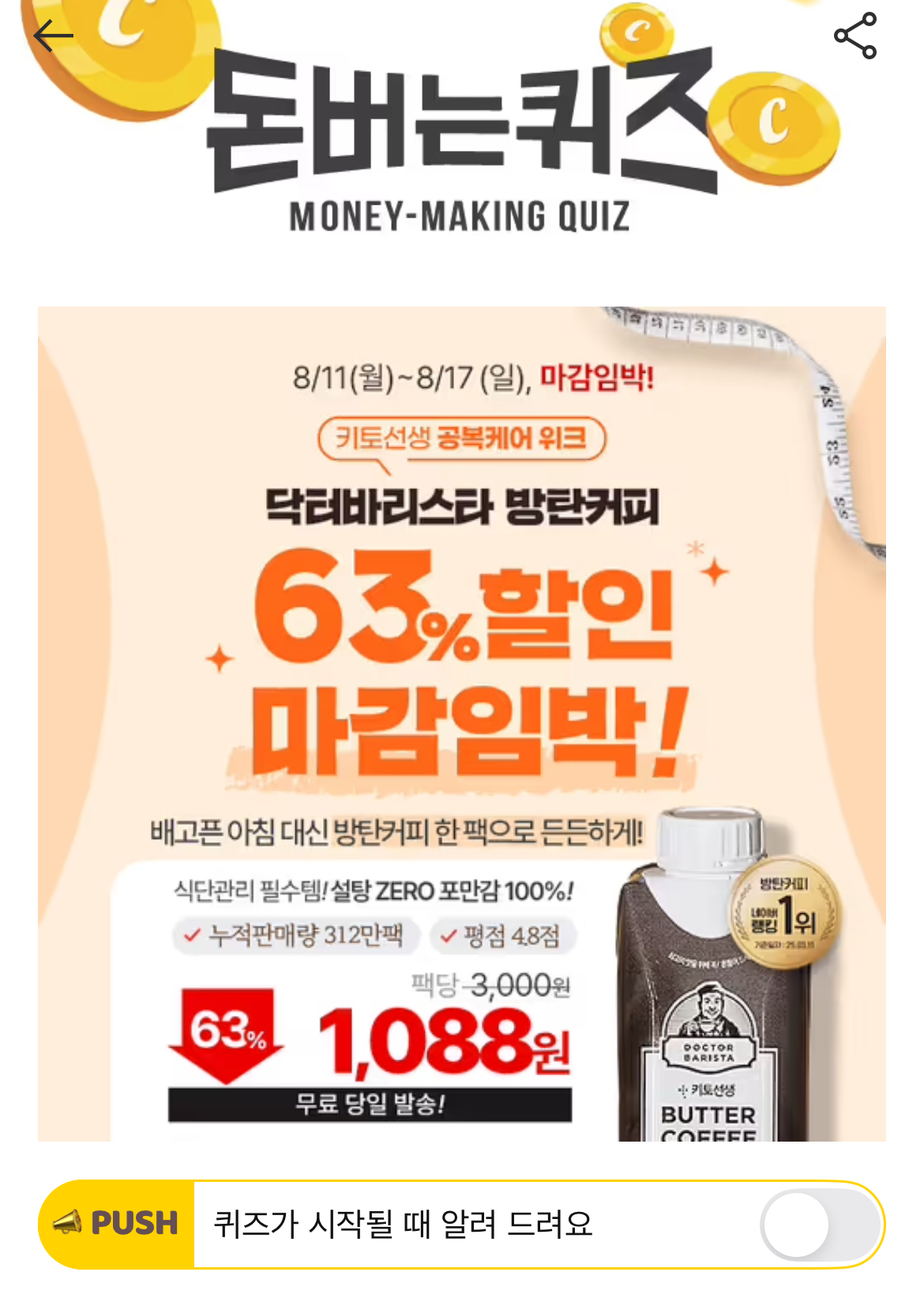 캐시워크 돈버는퀴즈 정답 닥터바리스타 방탄커피