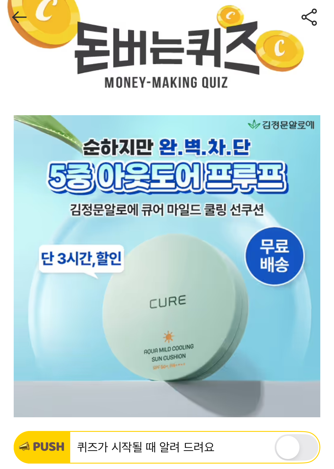 캐시워크 돈버는퀴즈 정답 김정문 알로에 선쿠션 O중