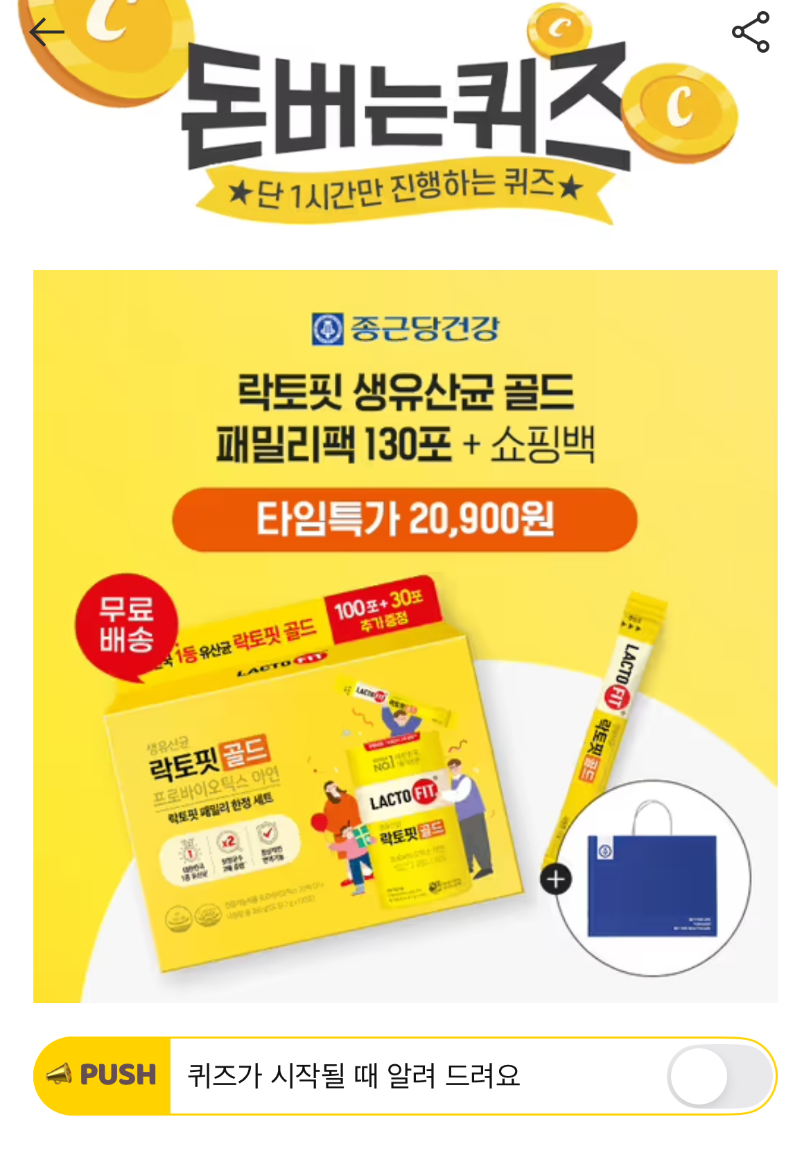 캐시워크 돈버는퀴즈 정답 종근당건강 락토핏 골드 패밀리팩 130포 00,000원