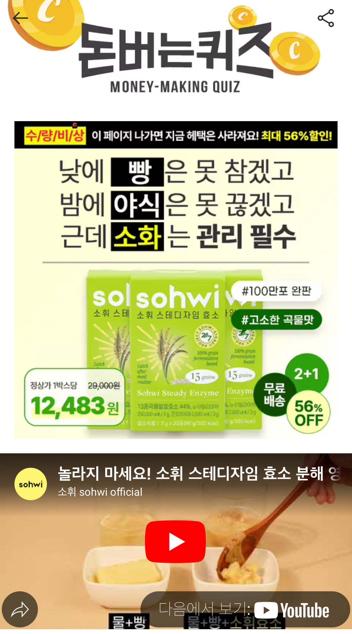 캐시워크 돈버는퀴즈 정답 소휘 소화효소 OOO식습관 / ㅌㄱㅁ