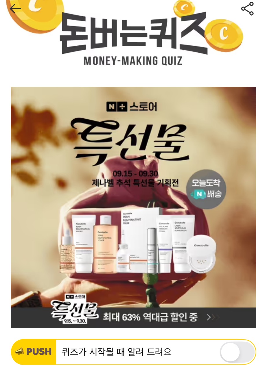 캐시워크 돈버는퀴즈 정답 제나벨 PDRN 스킨 OOO 2종 세트