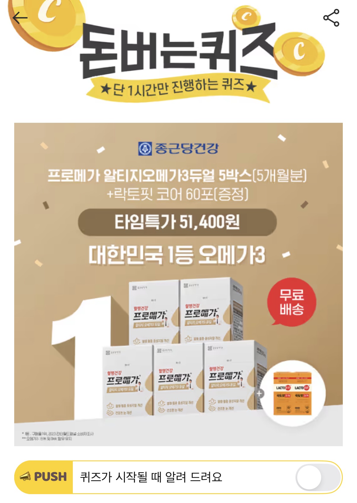 캐시워크 돈버는퀴즈 정답 종근당건강 프로메가 알티지 오메가3 듀얼 5박스+락토핏 코어 60포