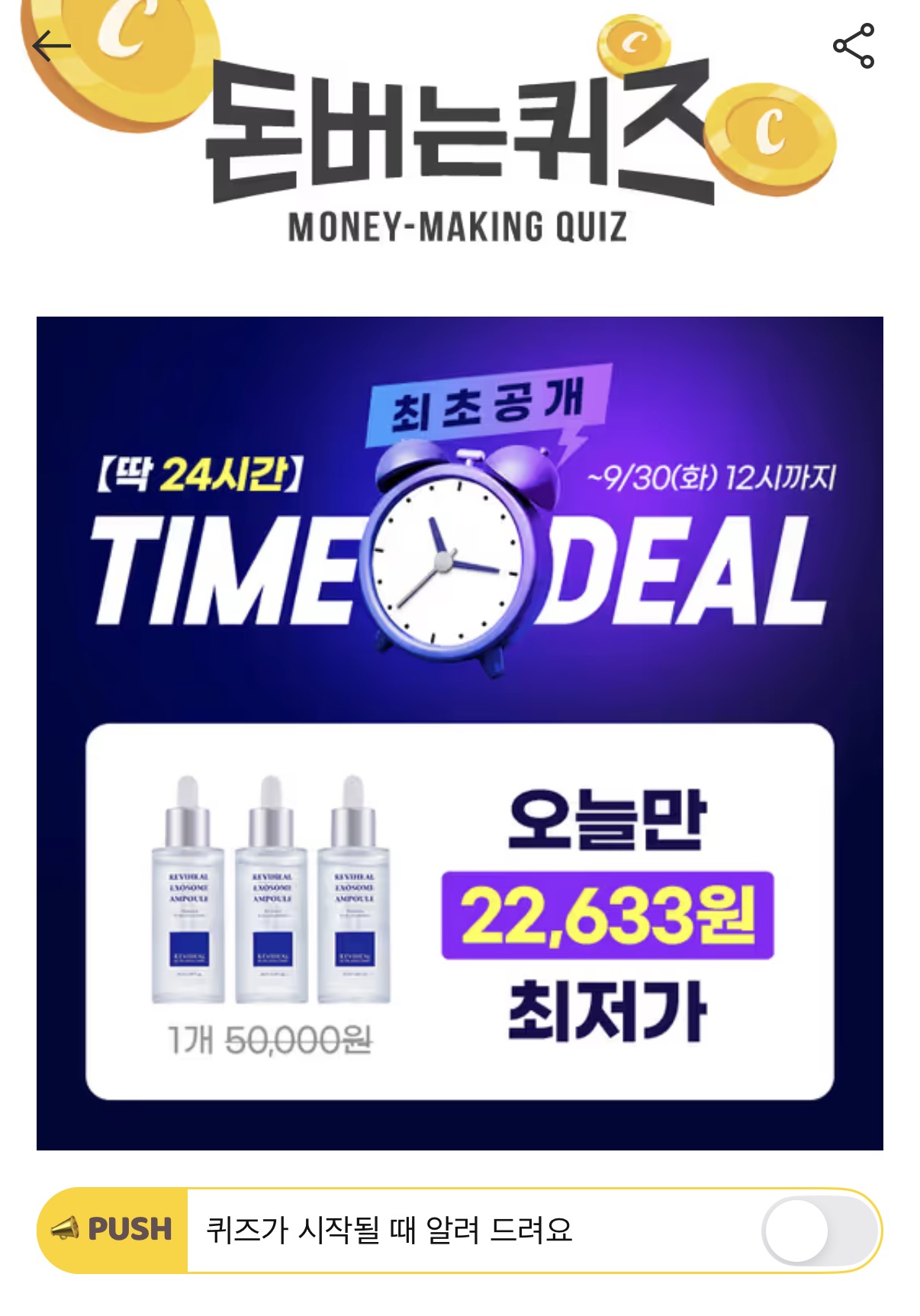 최초공개 타임딜, 앰플 1개 22,633원 리비힐 최초공개 타임딜 행사에서만 앰플 3개 구매 시 1개를 22,633원에 무려 OO%나 할인받아 구매할 수 있습니다. OO는 무엇일까요? (힌트 : 숫자)