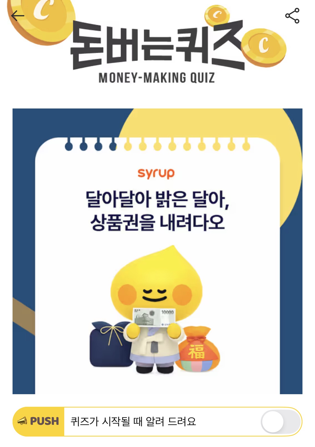 10월 한가위 시럽 이벤트! 달아달아 밝은 달아, 상품권을 내려다오. 응모만 해도 OO, 당첨 시 1만원 백화점 상품권, 응모한 날엔 추가로 5금까지 드려요! 하루 한 번 응모하기 누르고 한가위 행운을 잡아보세요 (힌트 : 숫자+한글)