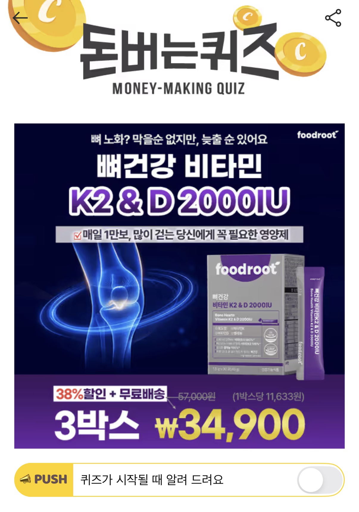 캐시워크 돈버는퀴즈 정답 푸드루트 비타민 K2 & D 2000IU