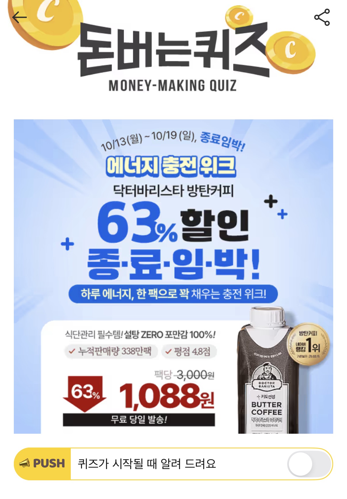캐시워크 돈버는퀴즈 정답 닥터바리스타 방탄커피
