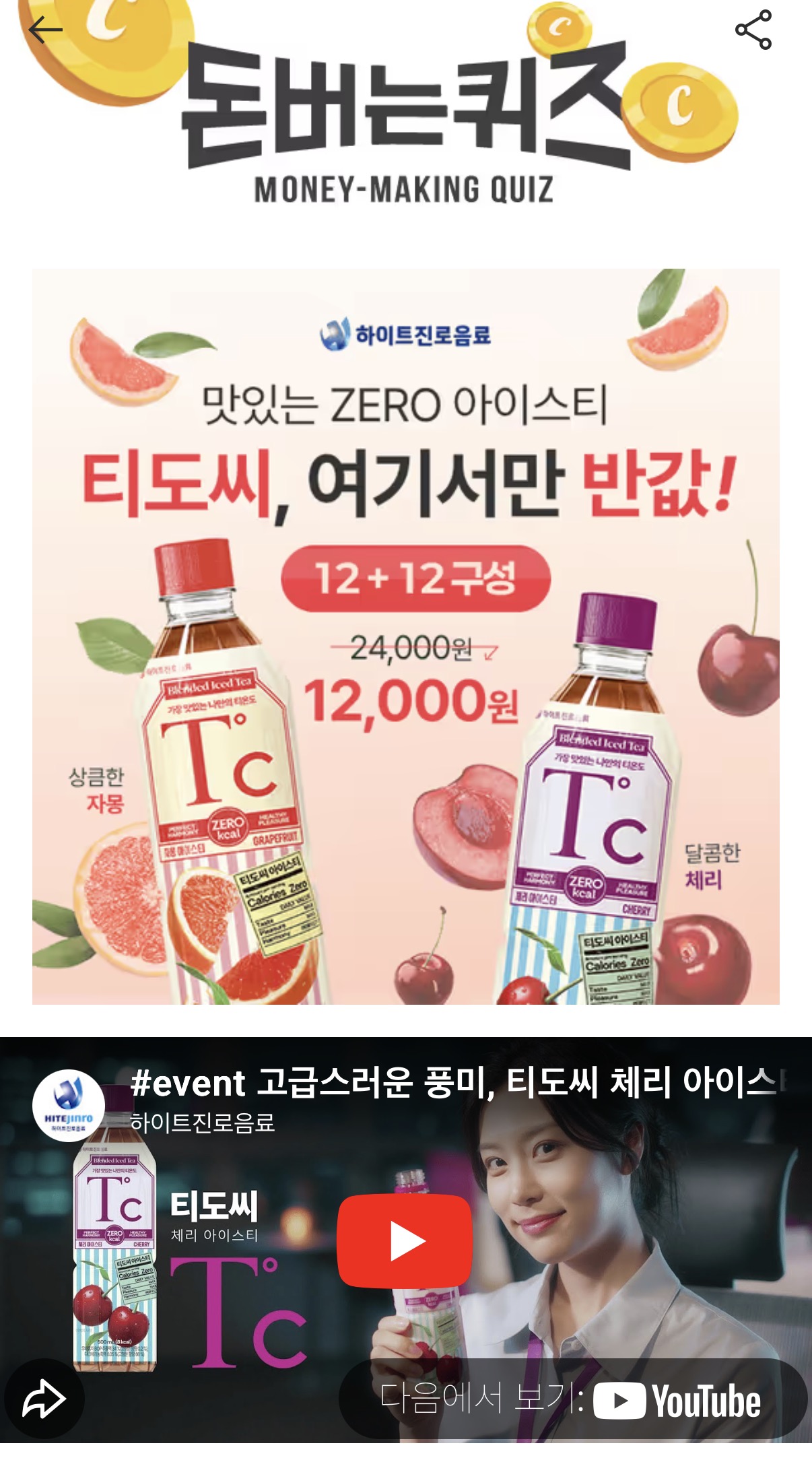 캐시워크 돈버는퀴즈 정답 하이트진로음료 아이스티 티도씨 ㅎㅇㅌㅈㄹㅇㄹ