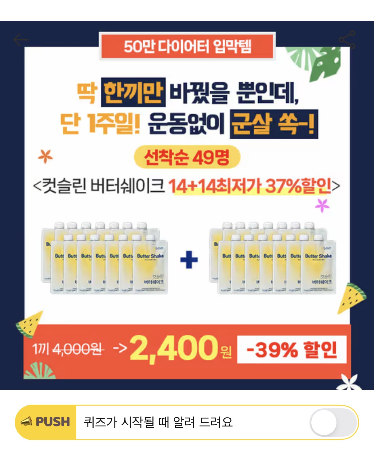 버터쉐이크 고객님 찐후기 입니다. 고소달달한데 당류0g라 스파이크 없이 혈당안정적이에요. 특히 식사하고 나면 금방 배고팠는데, 저녁까지도 식욕이 잠잠해요! 비만전문의 과학적인 설계로 탄생한 컷슬린 버터쉐이크! 당류 0g, 필요한지방 OOOO산 버터로, 식욕 억제 호르몬 분비유도해 식욕은 뚝 떨어지고, 점심에 먹으면 저녁까지 배불러요! 정답은 뭘까요?