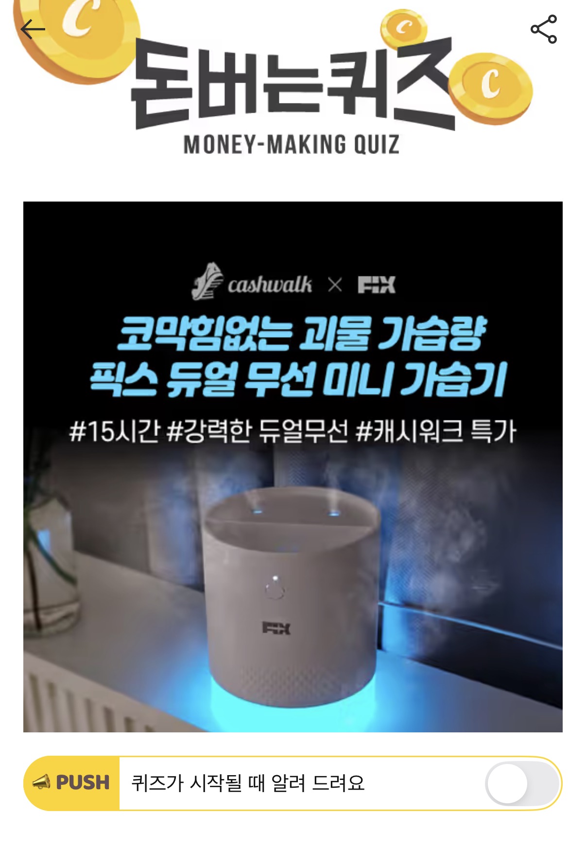 캐시워크 돈버는퀴즈 정답 픽스 듀얼 무선 미니가습기 ㅈㅅㅇ / ㅁㅂㅊ