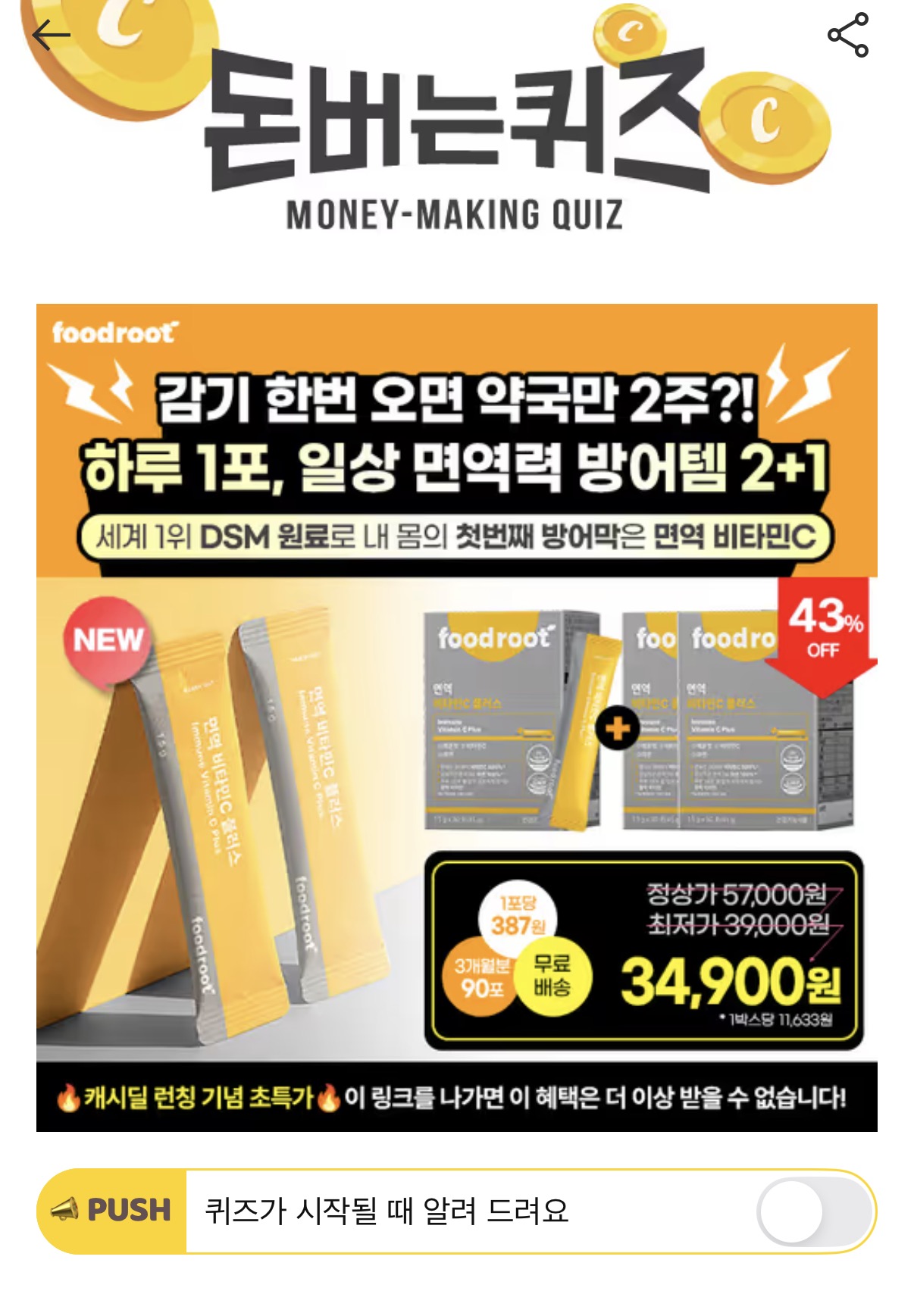 캐시워크 돈버는퀴즈 정답 푸드루트 면역 비타민