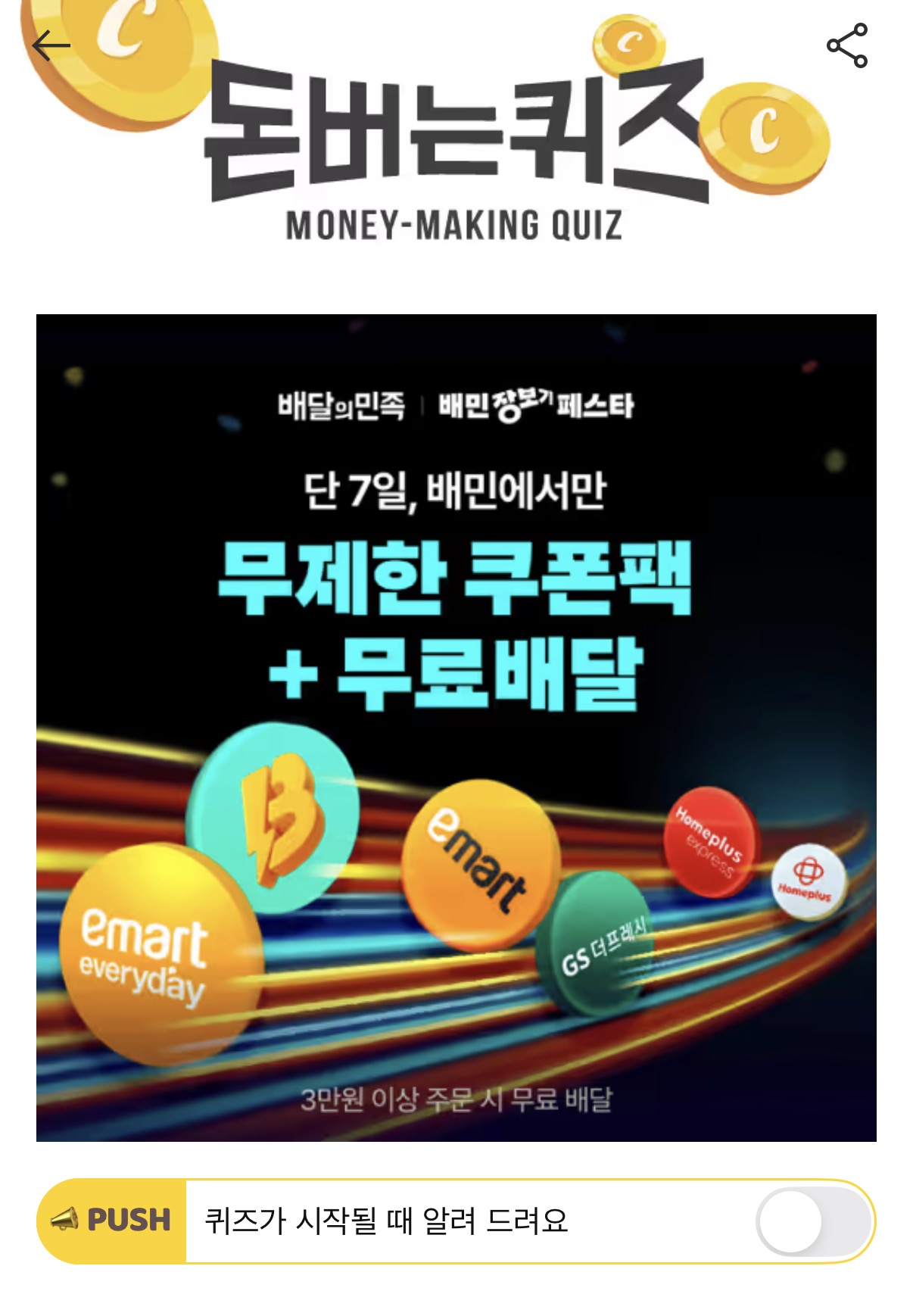 Q. 배민장보기페스타 진행중 무제한 쿠폰팩에 3만원 이상 주문시 무료배달 혜택까지! 배민에서 장보면 O시간 내 도착하니까 지금 둘러보세요. 빈칸에 들어갈 말은? (힌트 : 이벤트 페이지에서 확인하실 수 있어요)