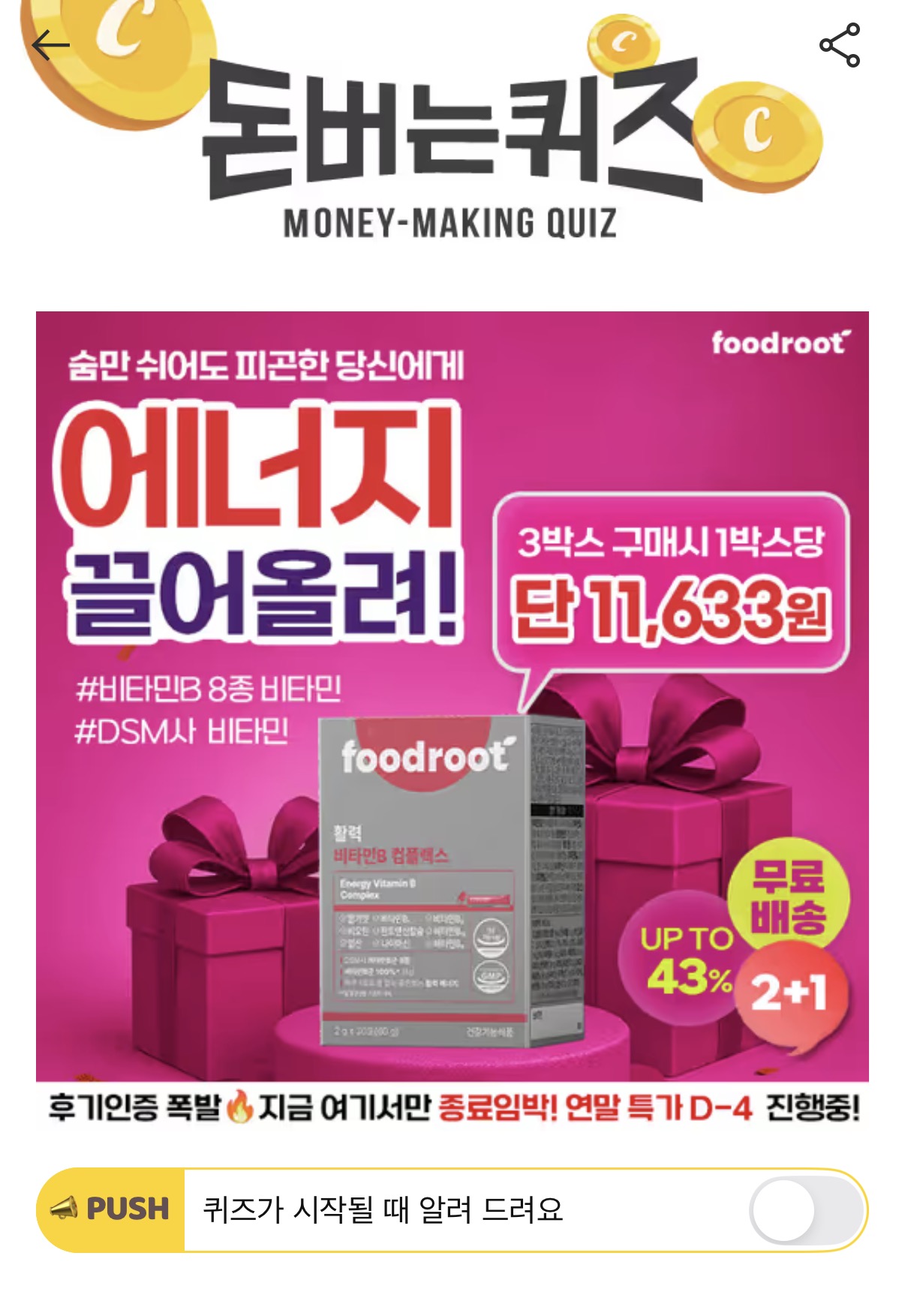 몸보다 머리가 더 무겁고 피곤한 날 많지 않아요? 집중도 안되고 멍하고..에너지 뿐 아니라 신경건강도 함께 챙겨야 해요 지금 온라인 최저가 진행 중 비타민 B는 수용성 비타민으로 OO에서 축적되지 않고 일정기간이 지나면 배출되어 꾸준한 섭취가 필요합니다.푸드루트 활력 비타민B는 8종 가득 채운 딸기맛 비타민으로 물없이 손쉽게 챙기세요! 여기서 OO은?