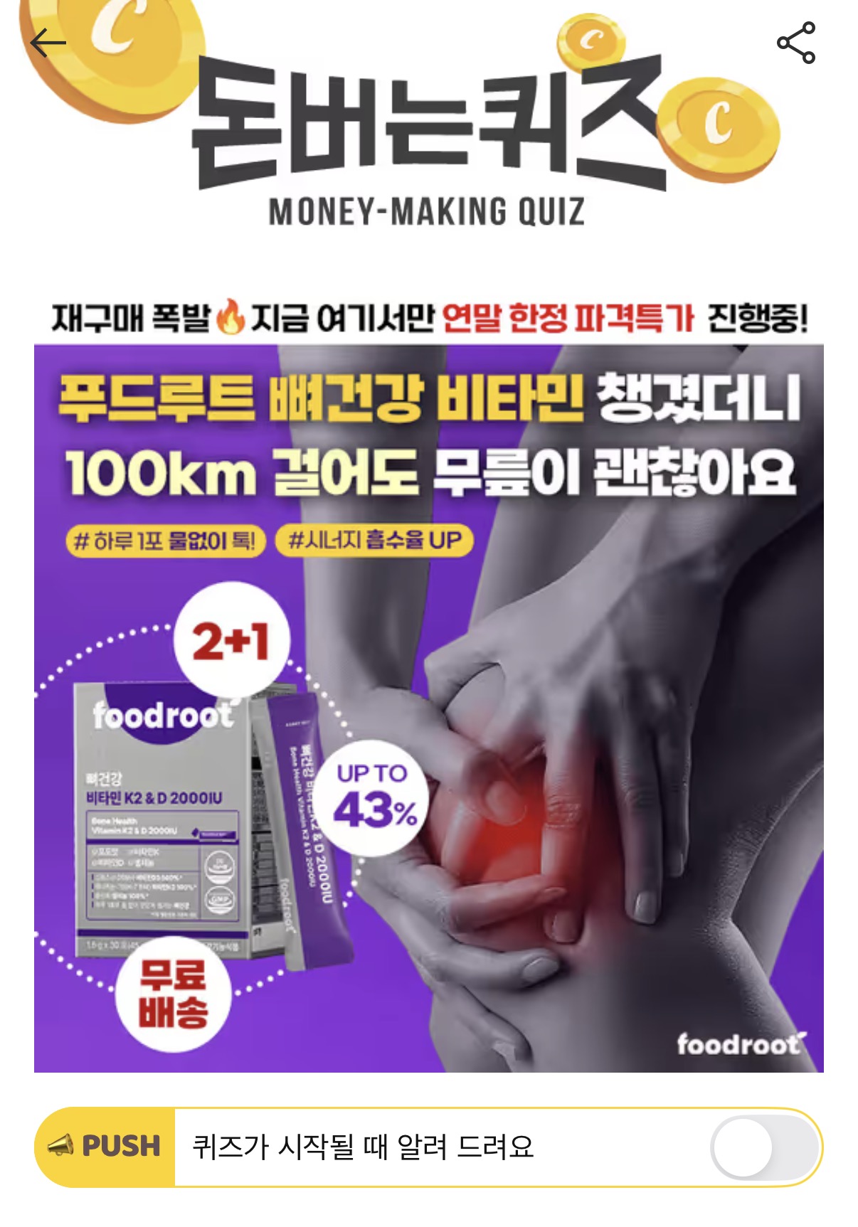 이거 먹고 100km 걸었는데 무릎 안아팠어요!" 푸드루트 뼈건강 비타민으로 새해에도 열심히 걸을게요연말 마지막 특가 햇빛을 쬐어야만 OO에서 합성되는 비타민D3는, D2보다 체내 활성도와 흡수율이 높습니다. 푸드루트 뼈건강 비타민에는 비타민D3가 일일섭취량 대비 500% 고합량으로 들어있습니다. 여기서 OO는?