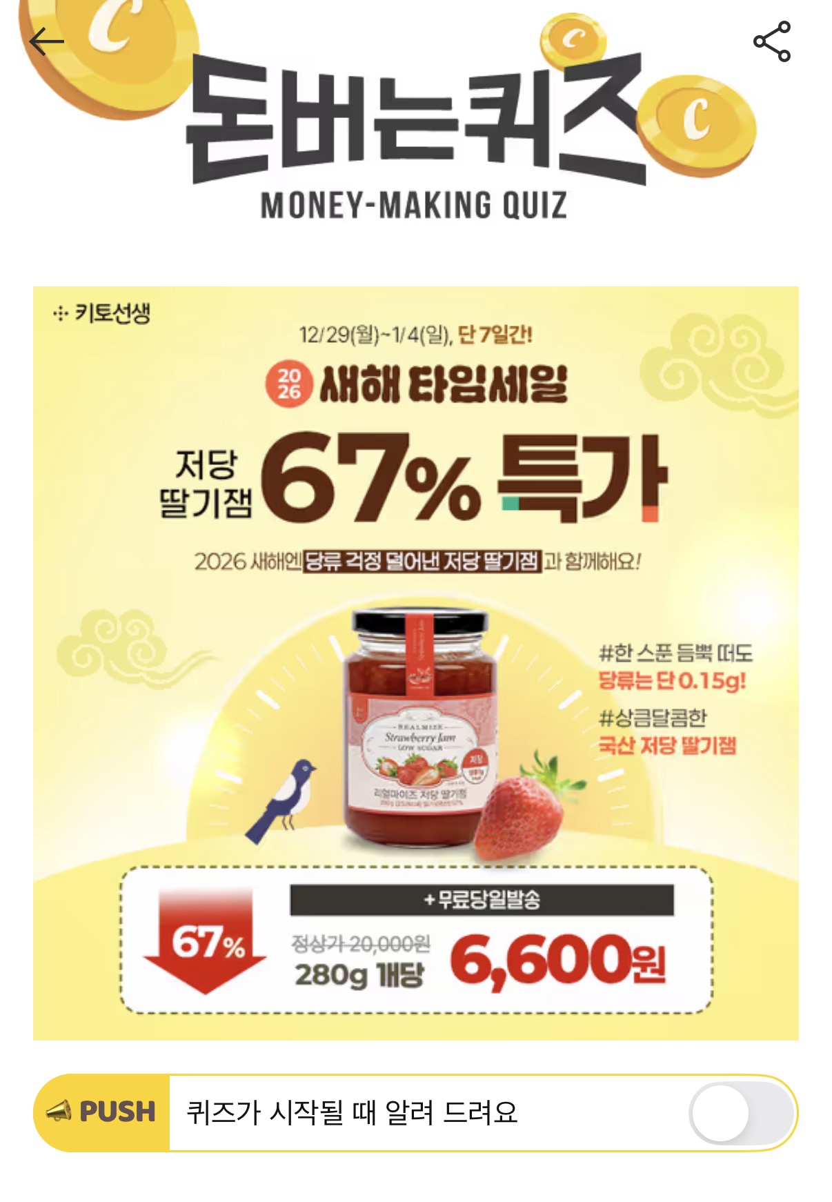새해맞이 타임세일] 국산 저당 딸기잼 67% 할인 + 개당 단돈 6,600원 + 무료당일발송 혜택까지 ( 본 혜택은 26년 1월 4일까지만 적용됩니다.) 리얼마이즈 저당 딸기잼은 설탕 대신 알룰로스를 사용했어요! 또한, 신선한 국산 딸기를 듬뿍 담아 딸기 함량을 보다 높였으며 딸기 본연의 OOO O을 지켰습니다. OOOO은 무엇일까요?