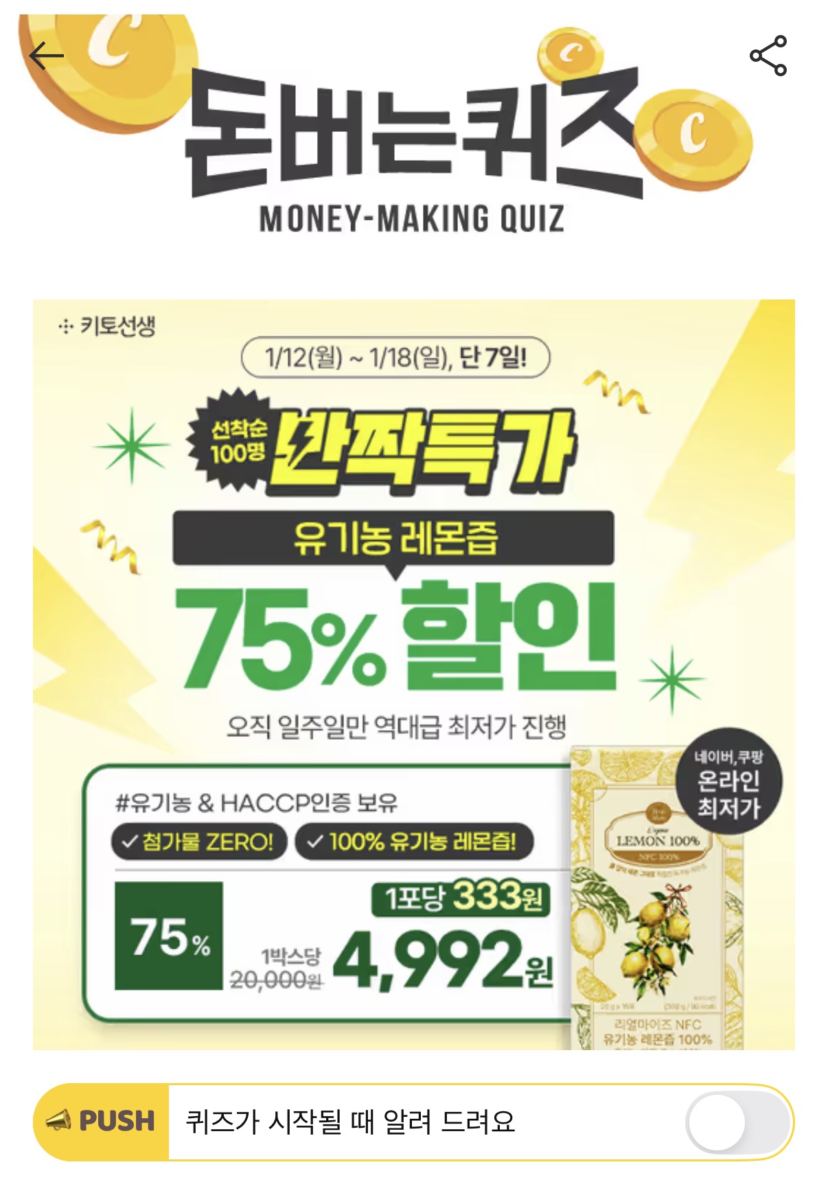 캐시워크 돈버는퀴즈 정답 리얼마이즈 유기농 레몬즙