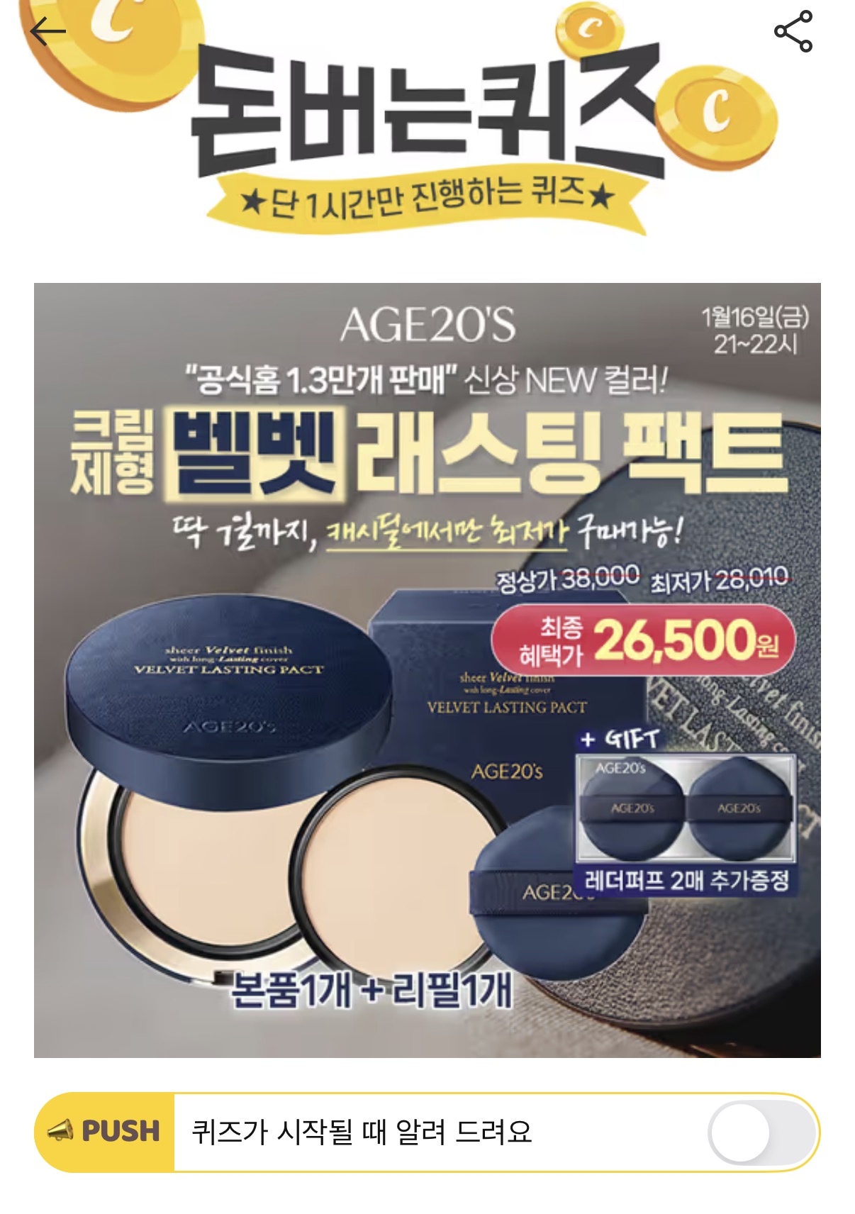 에이지투웨니스 벨벳 래스팅 커버팩트 본품+리필(14g)가 캐시딜 단독할인으로 26,500원+무료배송+레더퍼프2매입 증정 추가로 진행됩니다. 벨벳 래스팅 팩트는 72시간 깨끗하게 지속되는 커버, 단순 정제수가 아닌 OOOO 60%로 진정 케어까지 해줍니다. 촉촉한 발림성과 보송한 마무리로 만나보세요! 여기서 OOOO은 무엇일까요? (힌트: ㅇㅅㅊㅅ)