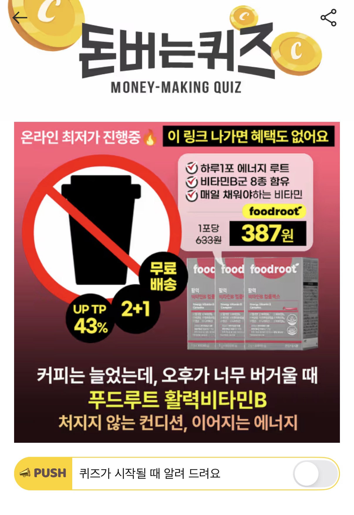 커피는 늘었는데 컨디션은 그대로여서 오후까지 버거울 때. 푸드루트 활력 비타민으로 컨디션도, 에너지도 다르게 채워요.온라인 최저가 링크 활력 비타민B 컴플렉스는 3대 영양소인 탄수화물,지방,OOO을 세포가 흡수가능한 형태의 에너지원으로 전환, 즉 에너지 대사와 에너지 생성에 도움을 줍니다. 여기서 OOO은? (힌트 : ㄷㅂㅈ)