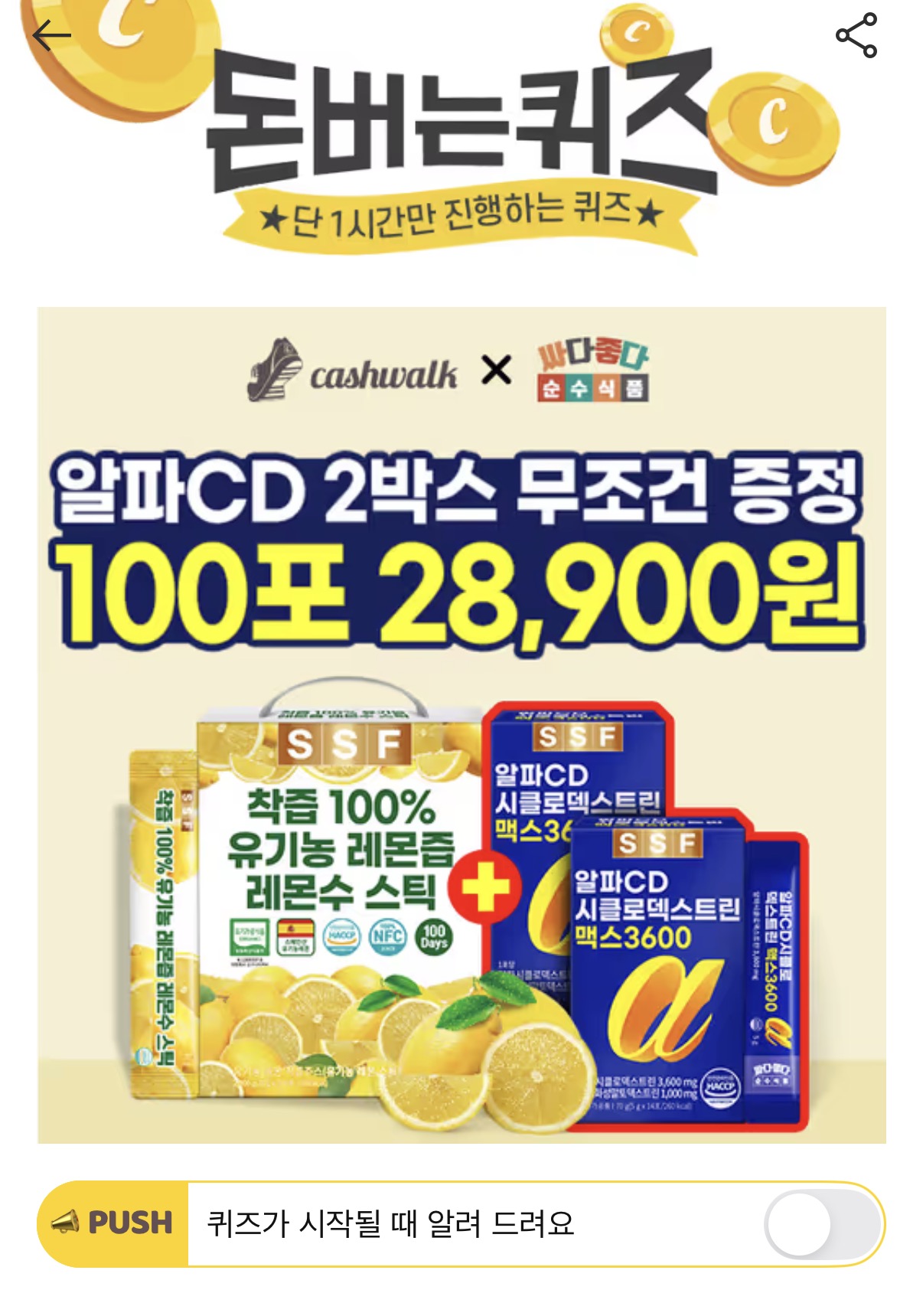캐시워크 돈버는퀴즈 정답 순수식품 유기농 레몬즙