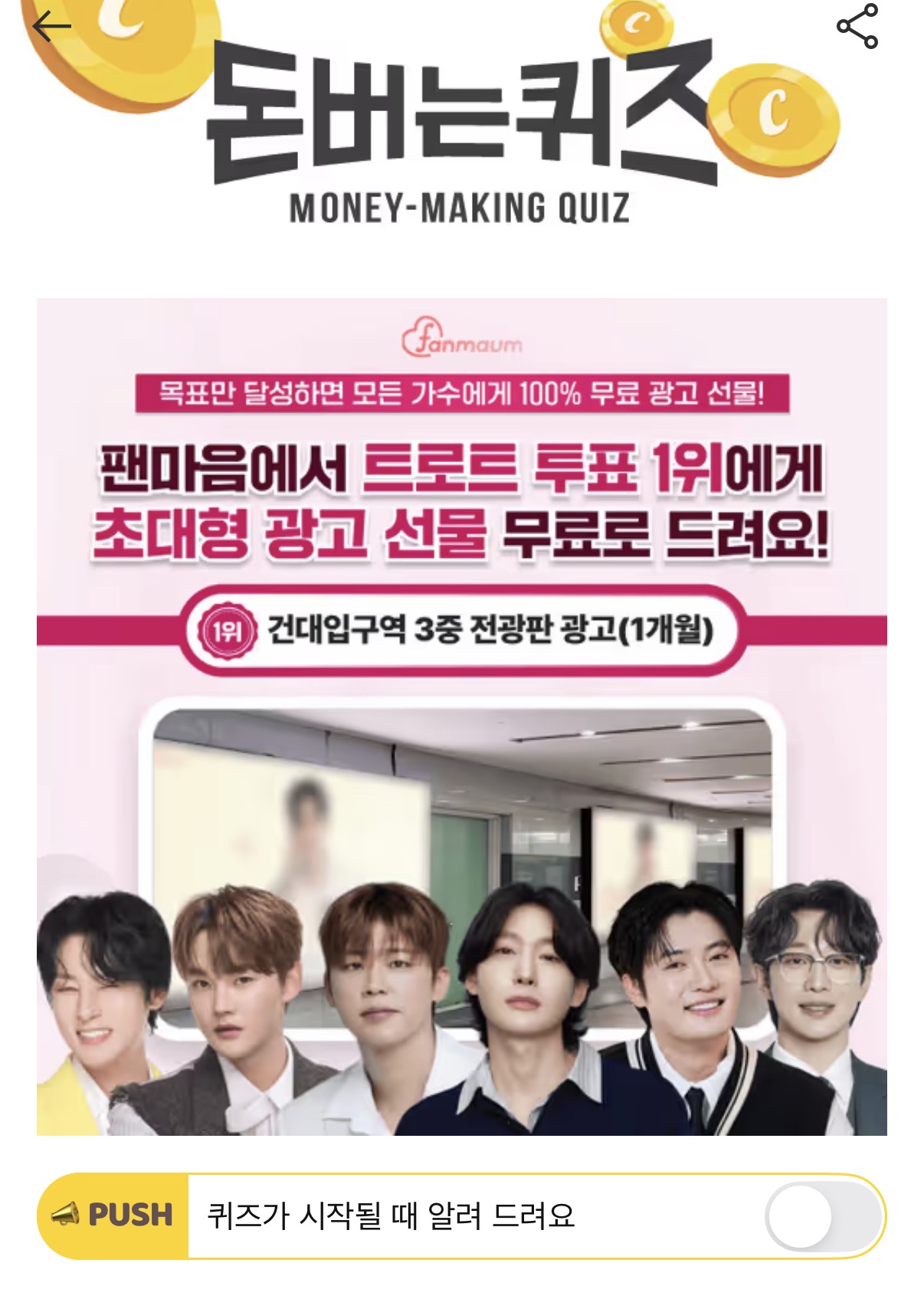 팬마음 트로트 스타 60차 투표 1위 스타에게는 하루 유동 인구 30만 명인 건대입구역에 OOOOO 광고를 1개월 동안 해드려요!