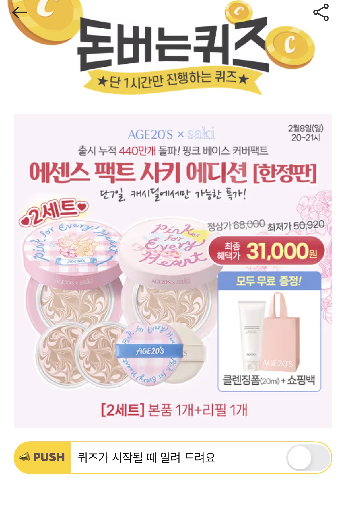 AGE20'S 디오리진 에센스 팩트 사키 에디션 본품2개+리필2개(12.5g) 캐시딜 특가할인 31,000원+쇼핑백+무료배송으로 진행됩니다 오리진 에센스/스킨케어링 성분으로 세미글로우 속광피부 연출로 피부로 느껴지는 편안한 촉촉함을 선사합니다 사용 72시간 후에도 피부 OOO을 85.7% 더 촉촉함을 유지합니다. 여기서 OOO은 무엇일까요? (힌트:ㅂㅅㄹ)