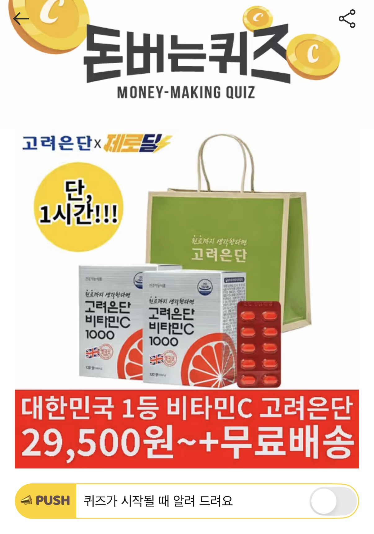 캐시워크 돈버는퀴즈 정답 캐시딜 타임특가 고려은단 비타민C 1000 OOOOO원