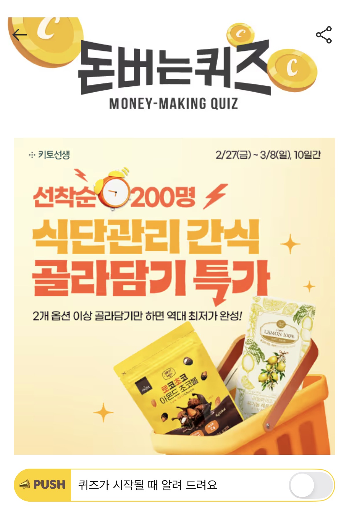 [선착순 200명] 식단관리 간식 골라담기! (+당일무료발송) 아래 4가지 구성 중 2개 이상 고르기만 하면 조합 상관없이 역대 최저가 자동적용! - 저당 아몬드초코볼 (3팩 / 8팩) - 유기농 레몬즙 100% (1박스 / 3박스) 로코초코 아몬드 초코볼은 달콤한게 땡길 때 OOO 없이 드셔보세요! OOO은 무엇일까요? (초성힌트 : ㅈㅊㄱ)