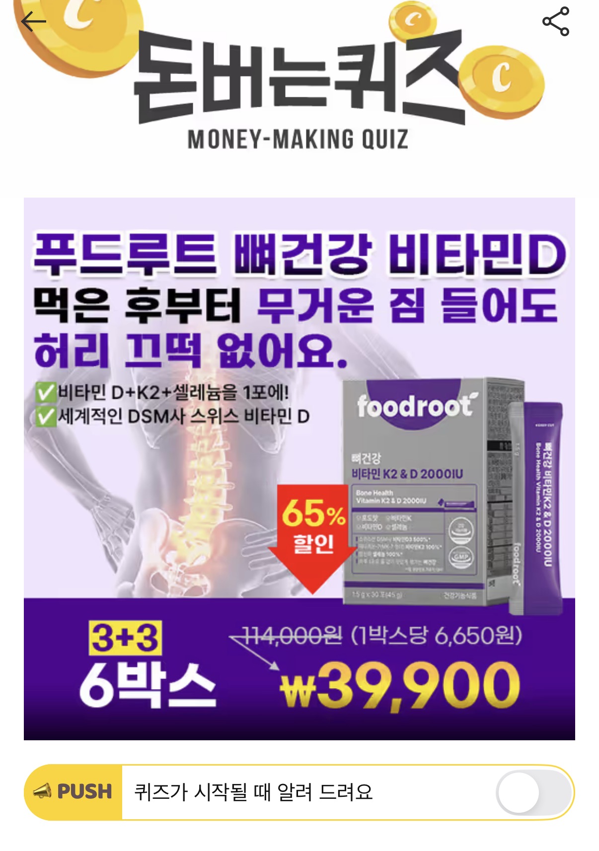 가벼운 화분만 들어도 욱신 거렸던 허리,푸드루트 비타민D 먹은 후부터 쌀 20kg 들어도 허리 거뜬해요! 65% 초특가 할인중 햇빛을 쬐어야만 체내에서 합성되는 비타민D3는, D2보다 체내 OOO와 흡수율이 높습니다. 푸드루트 뼈건강 비타민에는 비타민D3가 일일섭취량 대비 500% 고합량으로 들어있습니다. 여기서 OOO는? (힌트 : ㅎㅅㄷ)