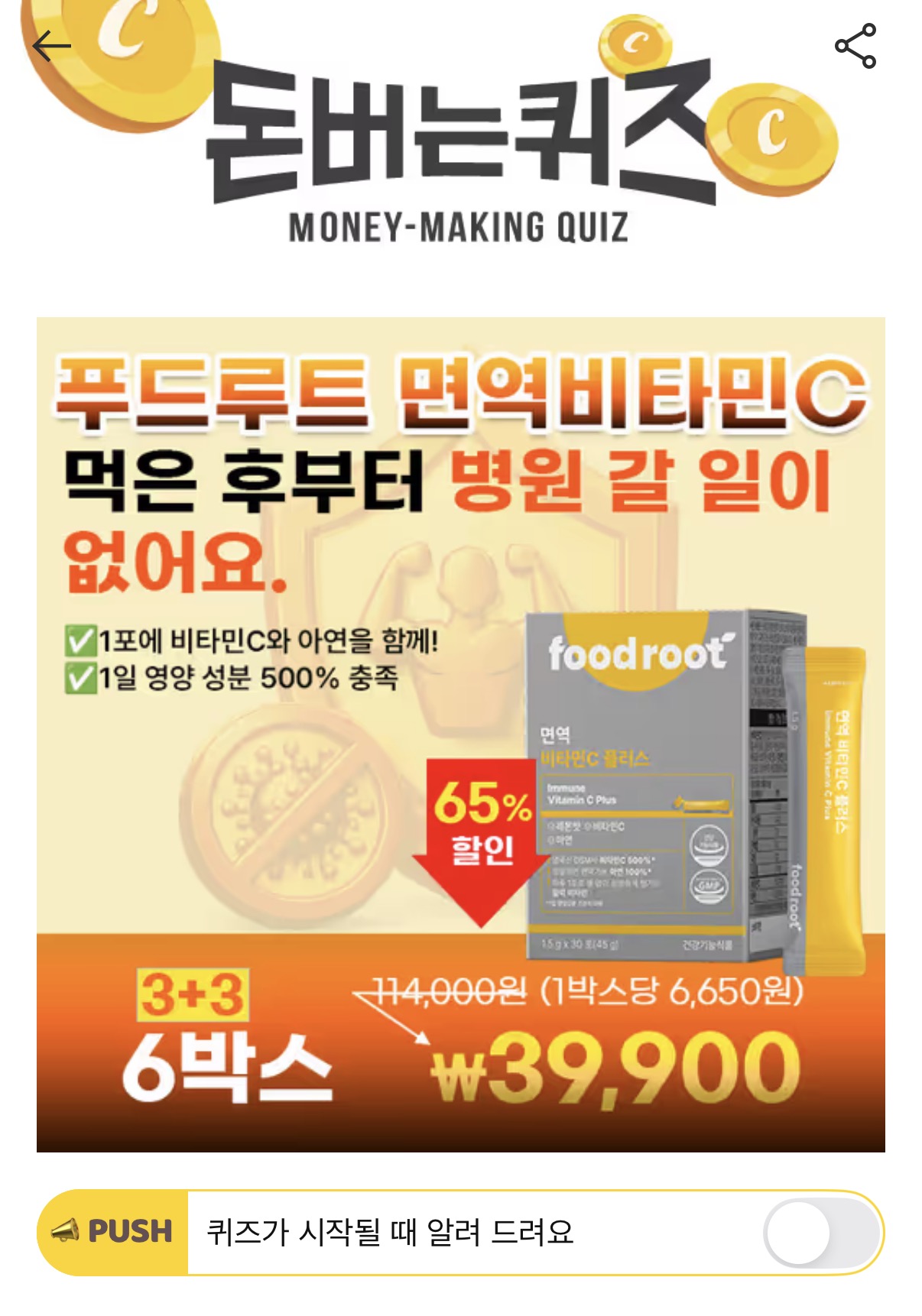 푸드루트 면역 비타민C 먹은 후부터 아프지 않아서 병원 갈 일이 없어요3+3 초특가 할인중 푸드루트 면역 비타민C는 단 1포에 비타민C OOO%+아연 100%를 담아 물없이 간편하게 섭취 가능하고, 면역기능과 항산화 관리가 가능합니다.스위스산 DSM사 프리미엄 비타민C를 사용한 믿고 먹을 수 있는 푸드루트 비타민C! 여기서 OOO은? (힌트:숫자)