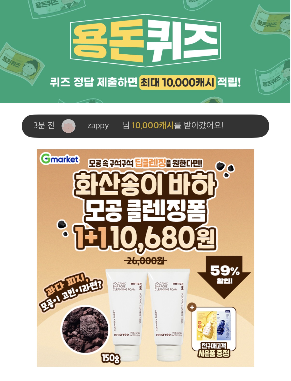 3300만개*돌파! 판매 1등**클렌징 폼 화산송이 바하 모공 클렌징 폼 150g 2개 + GIFT 단하루 10,680원 특가! ️모공 속부터 각질까지 한 번에! ️쫀쫀하고 부드러운 OOO 텍스처 ️여드름성 피부 완화 기능성 완료 G마켓 이니스프리 특가, 놓치지 마세요~! (힌트: ㅅㅋㄹ)