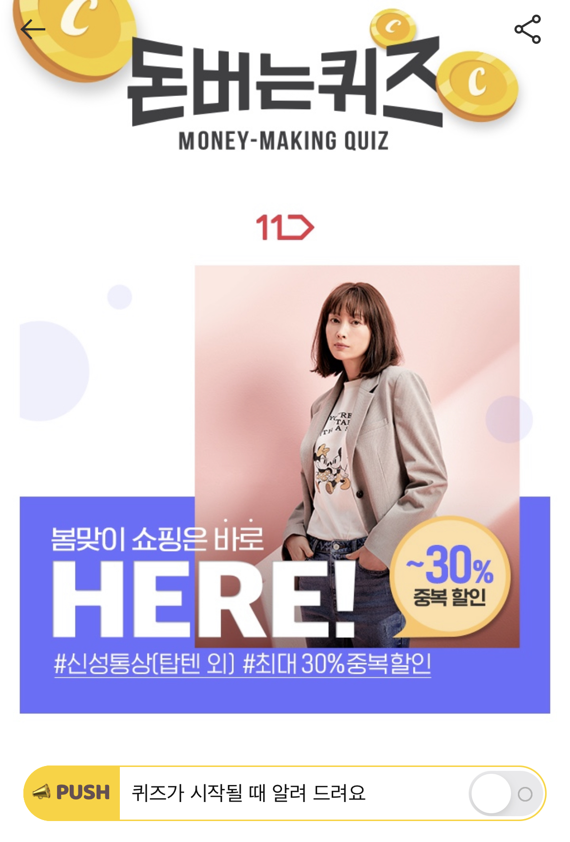 캐시워크 돈버는 퀴즈 정답 11번가 최대 OO% 할인 숫자