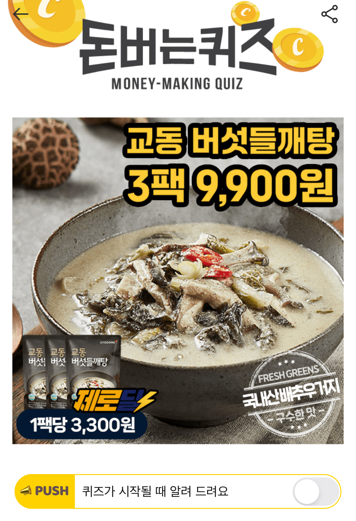 캐시워크 돈버는퀴즈 정답 캐시딜 타임특가 교동식품 버섯 들깨탕